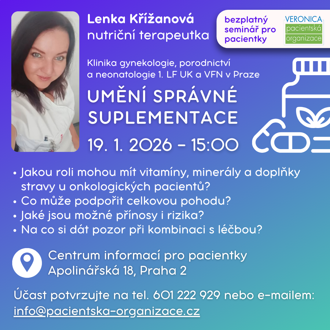 Milé pacientky, zveme vás na bezplatný seminář Umění správné suplementace. Účast prosím potvrzujte na tel. 601 222 929 nebo na náš e-mail: info@pacientska-organizace.cz